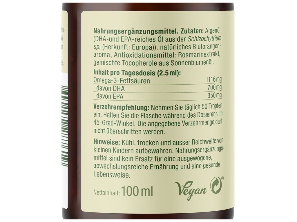Zloženie: | Olej z rias (olej bohatý na DHA a EPA zo Schizochytrium sp. (Pôvod: Európa)), prírodná aróma pomaranča, antioxidanty: extrakt z rozmarínu, zmes tokoferolov zo slnečnicového oleja. |